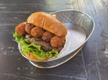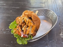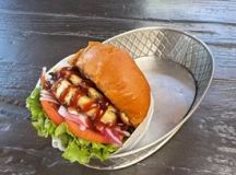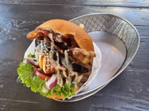 Angus beef patty glazed w/ Jack Daniel's honey bourbon, topped w/ bacon, fried eggplant, cheddar cheese, lettuce, onion, tomato, mayo, & topped w/ sesame seeds