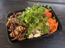 Mixed lettuce, tomatoes, teriyaki chicken, cilantro, almonds, peanuts, sesame seeds, & green onion w/ sesame ginger dressingon the side