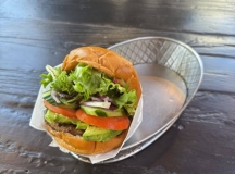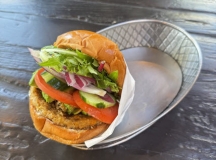 Organic 100% veggie patty, avocado, onion, tomato, cucumber, mixed lettuce, & vegan mayo