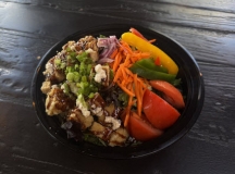 Fried tofu w/ sweet soy sauce glaze, mixed lettuce, tomato, bell peppers, carrots, onion & cucumber