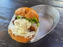 Fish patty, tartar sauce, provolne cheese, cabbage salad, & topped w/ sesame seeds.