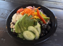 Mixed lettuce, avocado, carrot, cucumber, bell pepper, tomato, mushroom, & onion w/ sesame ginger dressing on the side